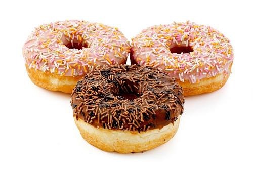 Ring doughnuts topped with white icing, strawberry flavour icing, and chocolate flavour icing. Fully baked, ready to thaw and serve.